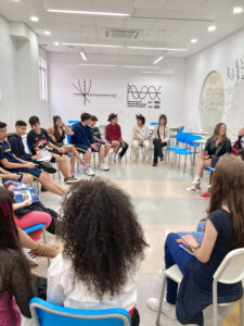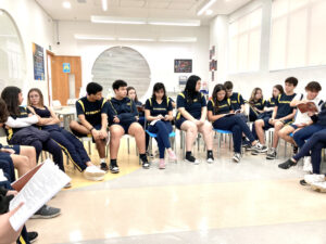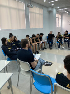 Durante o encontro, o professor conduz uma conversa leve e reflexiva, que incentiva os alunos a expressarem suas interpretações e percepções sobre a obra. Assim, a leitura ganha vida: é comentada, debatida e sentida em conjunto.
